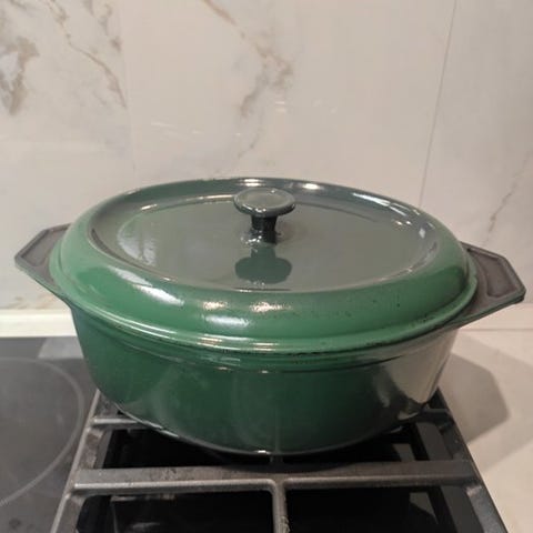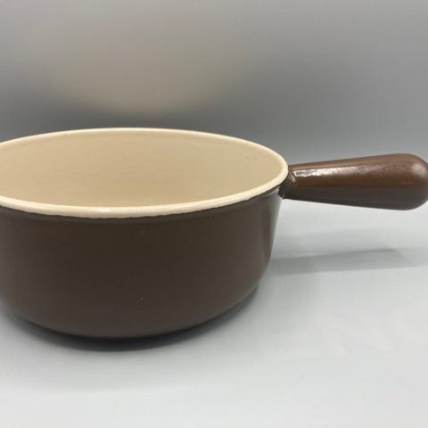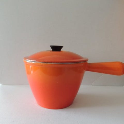 Fantastisk en-stykke støbejns-emaljeret stegepande fra det franske mærke NOMAR, genkendelig på sin gradiente røde emalje og sin overflade af rå støbejern uden emalje til en markant tilberedning, sin afbalancerede form med dobbelt hældetud og sin robuste konstruktion i ét stykke. En model, der er både funktionel og meget æstetisk, typisk for franske kvalitetsproduktioner fra midten af det 20. århundrede.