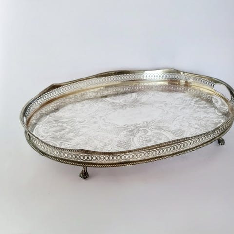 Smukt stort sølvbelagt fad, stående på 4 kløfødder og med en udskåret opstående kant forsynet med guirlander.