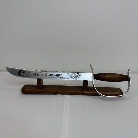 Smuk champagne-sabel i messing og stål, med sit oprindelige træstativ, fra det berømte mærke Roger Orfevre, i god stand med enkelte tegn på ældning (se billeder)