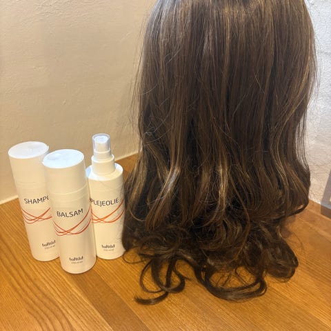 Paryk, 5 kemohuer, shampoo, balsam og hårbørste UBRUGT