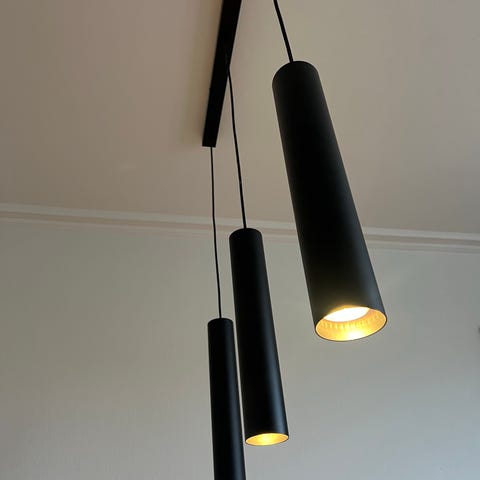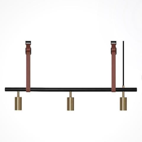 Perfekt lampe til køkken ø. 180 cm. Brun læder, sortmalet metalrør og spots i bruneret messing. Designet af Niclas Hoflin 2014.