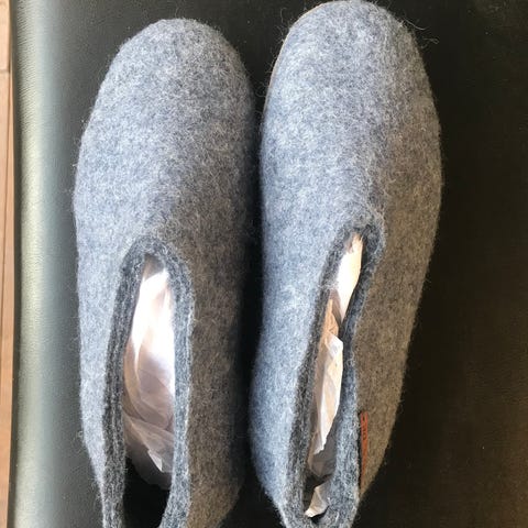 Hope hjemmesko i størrelse 40. Modellen er i grå uld med skridsikker sål. Hjemmeskoene er lukkede og går op over vristen, hvilket giver en tæt pasform om foden. Velegnet til indendørs brug på kolde gulve og som behageligt fodtøj i hjemmet. Leveres med stofpose som på billederne.