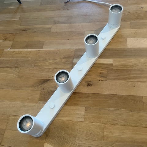 Den kan opsættes i loftet eller på væggen. Tre pærer medfølger. :-)