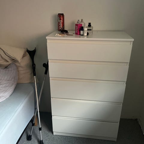 Hvid/brunsort ASKVOLL kommode med 5 skuffer gives væk grundet flytning.