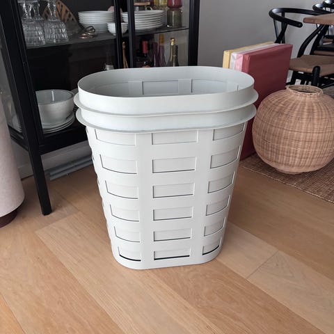 HAY kurv i plast med åbent, firkantet mønster. Kurvene ses i lysegrå og mørkegrøn (army) nuancer og kan bruges til opbevaring, f.eks. vasketøj, legetøj eller tæpper. Fremstillet i robust plast, velegnet til indendørs brug. Designet er præget med HAY-logo i bunden.