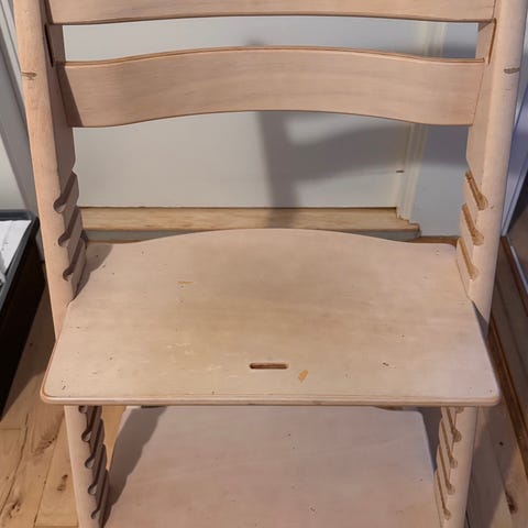 Stokke Tripp Trapp højstol i lakeret træ. Der er ekstra forlængere bagpå for stabilitet. Lidt brugsspor.
