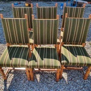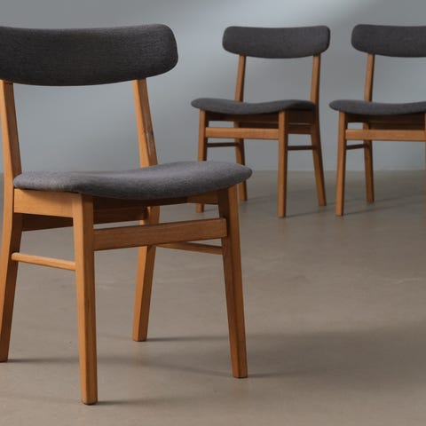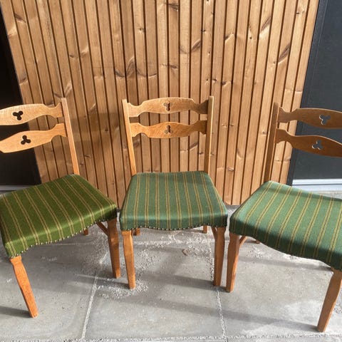 Sælger disse 3 spisebordsstole tegnet af Henning Kjærnulf. Stolene er lavet i massiv egetræ og ryggen i teaktræs finer. Stolene er blevet renoveret = teaktræ slibet og olieret og Egetræet slibet og sæbebehandlet. Sæderne er ny polstret(prof)