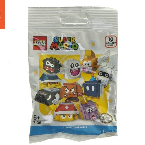 Pose indeholder en LEGO Super Mario figur fra serie 1, der består af forskellige karakterer at samle. LEGO nummer 71361 angivet på pakken. Serien er beregnet til børn over 6 år og inkluderer samlebare modeller i samarbejde med Nintendo.