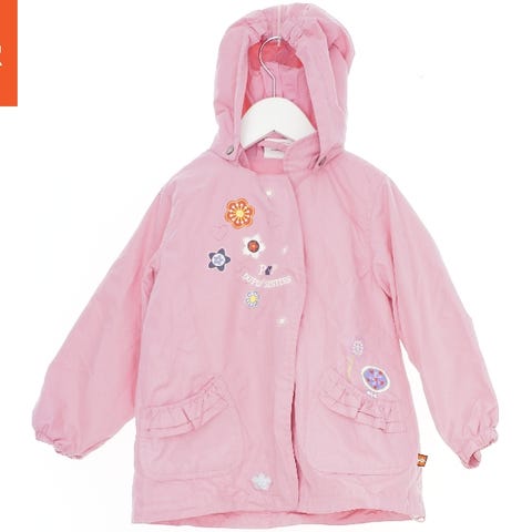 Lyserød jakke til børn med lynlås og elastiske manchetter. Jakken har lommer foran og et lille blomstermotiv. Der er et diskret refleksbånd nederst på ryggen. Mærket LEGO Wear ses både foran og bagpå.