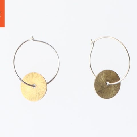 To par runde øreringe. Det første par er tynde metaløreringe med en diameter på 50 mm. Det andet par er bredere og har et sort og guld mønster. Begge sæt har lukninger, der sikrer, at de forbliver på plads, når de bæres.