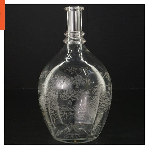 Smuk mundblæst glaskaraffel med dekorative indgraveringer og elegant form. Højde: 29 cm. Formentlig Holmegaard. Ingen skader.