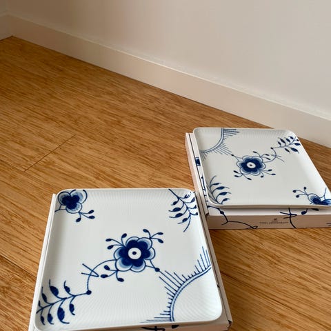 Royal Copenhagen Blå Mega Riflet asiet i porcelæn i farverne koboltblå og hvid. Asietten har en diameter på ca. 23,5 cm og er dekoreret med det karakteristiske Blå Mega Riflet mønster.