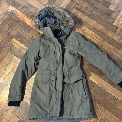 Didriksons jakke til pige i str. 150. Jakken er fremstillet i polyester og er i en grøn farve. Den har gennemgående lynlås foran, hætte og sidelommer med lynlås. Quiltet og vatteret design, der giver ekstra varme. Velegnet som yderjakke i køligere vejr.
