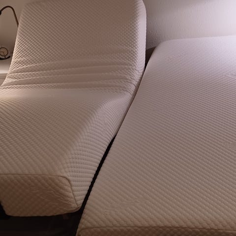 Madrasserne er monteret på elevationsbunde, som kan justeres i hoved- og fodende. Begge madrasser har aftageligt betræk med mønstret overflade. Velegnet som dobbeltseng med to separate elevationssenge, hvor hver side kan indstilles individuelt efter behov.