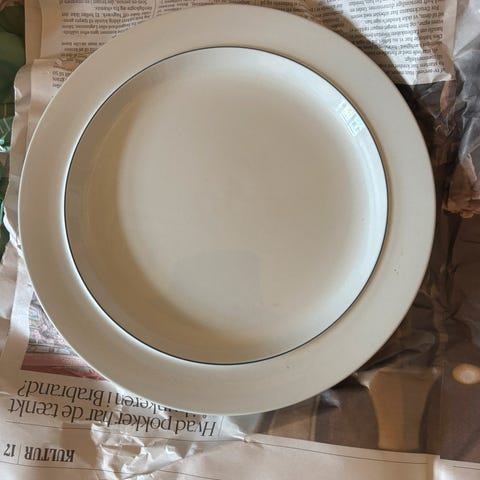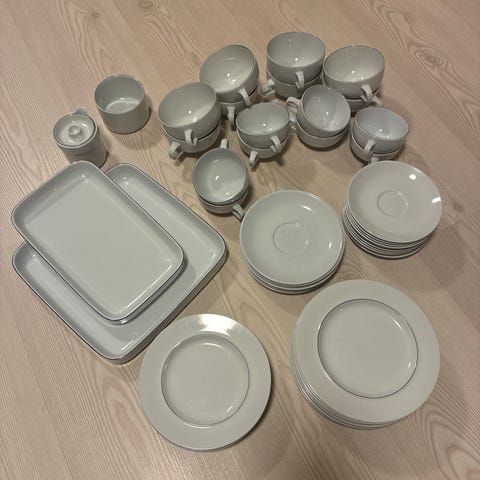 Royal Copenhagen "BLÅ KANT" stel i hvidt porcelæn. Sættet omfatter forskellige typer tallerkener, skåle, krus, kopper med underkopper samt fade i flere størrelser, som ses på billederne. Egnet til både hverdag og mere formelle måltider. Designet er enkelt og ensfarvet, hvilket gør det let at kombinere med andet service. Antal af de enkelte dele kan optælles ud fra billederne eller efter nærmere oplysning fra sælger.