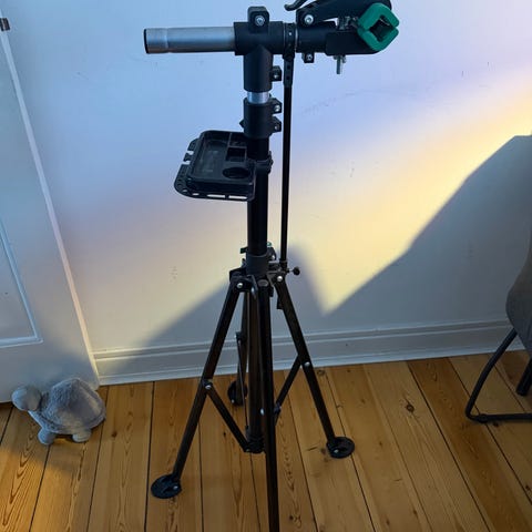 Cykel reparationsstativ med justerbar holder i sort med blå detaljer. Stativet har trebenet fod for stabilitet og højdejusterbar midterstang. Øverst er der en klemme/holder med plastbeskyttelse til fastgørelse af cykelrammen. Midt på stativet er der en bakke til værktøj og smådele. Velegnet til vedligeholdelse og reparation af cykler i hjemmet eller værkstedet.