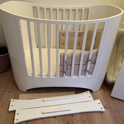 Leander tremmeseng i hvid. Klassisk babyseng, der kan ombygges fra tremmeseng til juniorseng ved hjælp af udbygningsdele. Sengen har justerbar bund, så den kan tilpasses barnets alder fra spæd til junior. Billederne viser både tremmeseng, juniorseng, udbygningssæt, madrasdel. Med . Sendehest fra IKEA har fungeret til UG og original Leander sengerend I cappuccino.