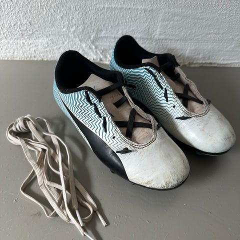 Puma fodboldstøvler i størrelse EU 31 (UK 12, US 13, 18,5 cm). Modellen er med snørelukning og lav skaft-højde. Overdelen har orange/sort mønster og sort snude og pløs. Støvlerne har faste knopper velegnet til spil på græsbaner. Egnet til børn med fodlængde omkring 18,5 cm.