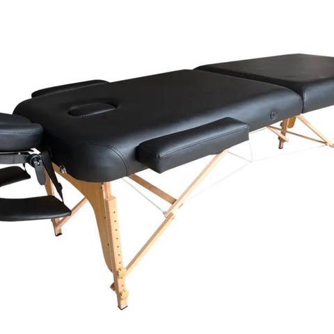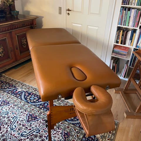 Massagebriks, Kilberry. Pæn stand. Kan reguleres i højden, så den passer til behandlerens højde. Med taske til opbevaring og transport.