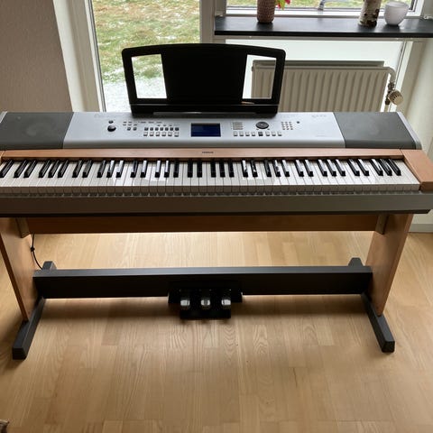 Godt Yamaha P-45 digitalpiano med 88 vægtede tangenter i sort finish. Modellen har fuldt klaviatur i pianostørrelse og er velegnet til både øvning og brug i hjemmet eller øvelokalet. Instrumentet står på stativ som følger med gratis. Egnet til både begyndere og mere øvede.