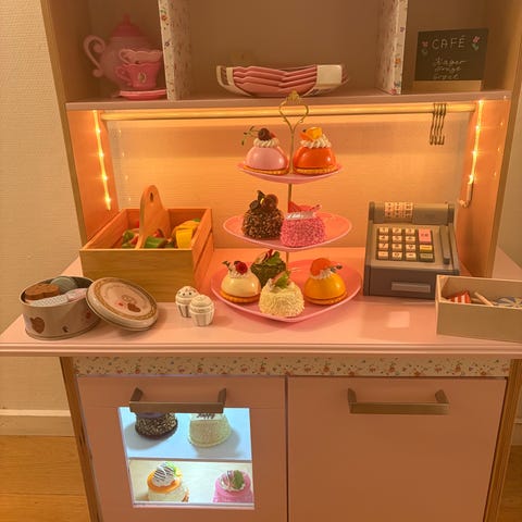 Køkkenet er desuden udstyret med små lamper (aaa batterier) m/ fjernbetjening. Batterier skal udskiftes. Lys kan også tændes med at trykke på dem og lyser i forskellige farver.