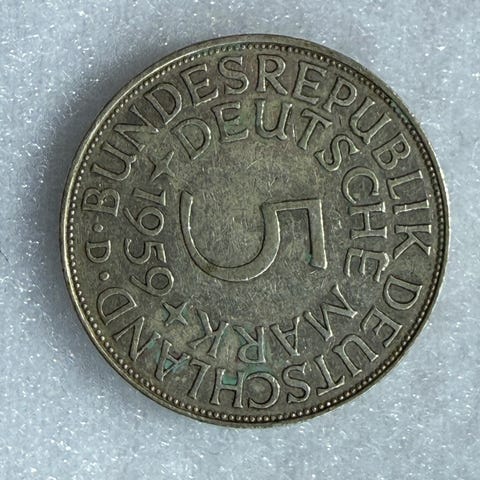 10 tyske mark af sølv udgivet for 800 års jubilæum (1190-1990) for Teutonic Order (Tysk Orden) præget med billede af Den Tyske Ørn samt Madonna med barn.