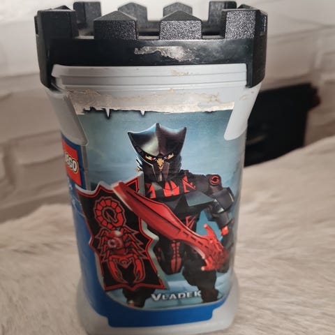 Lego Knights’ Kingdom figur med tilbehør i blå og grå plast. Sættet omfatter en større ridderfigur med skjold (se foto) og 2 våben samt en mindre figur i beige og brun. Der medfølger original beholder og en trykt vejledning. Egnet som byggesæt og samlerobjekt for børn fra 8 år og opefter, jf. angivelse på vejledningen. Ca. 25 år gammel.