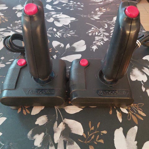 QuickShot Flight Grip joystick sæt i sort plast. Sættet består af to joysticks med base og håndtag med røde knapper. Hver joystick har flere knapper på håndtaget samt kontakt til autofire på basen. Tilsluttes med fastmonteret kabel med 9pol stik. Egnet til brug med ældre computere eller spillekonsoller, der understøtter denne type joysticktilslutning
