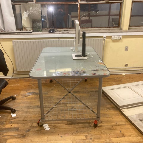 Skrivebord i stål med glasplade. Skal afhentes senest fredag den 13. feb
