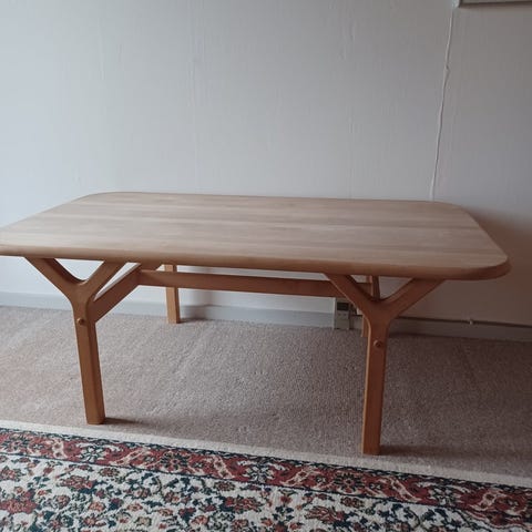 Flot sofabord i massiv bøg, med tremmehylde. Mål : længde 130 cm. Bredde 85 cm. Højde 55 cm. Fra Haslev møbelsnedkeri. Der er lidt brugsspor, men kan slibes. Fra dyre og røgfrit hjem.