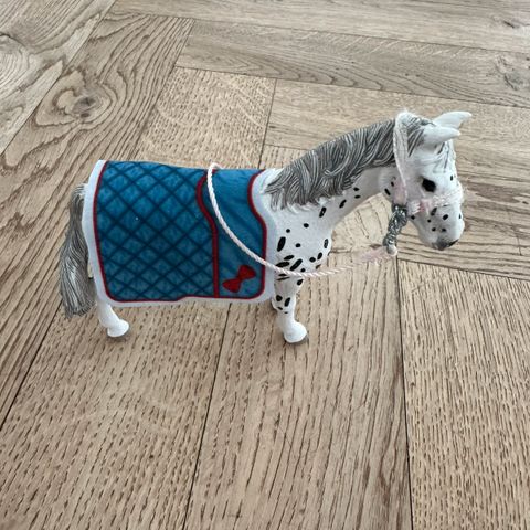 Pippis hvide hest med sorte prikker og grøn grime. Den har også et blødt, lysebrunt man- og halebehåring. Størrelsen er 33x37 cm. Tags: legetøjsdyr, hest, plys