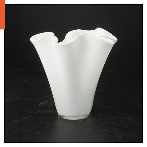 En dekorativ vase med en bølget kant, lavet af hvid glas. Vasen har en unik form og er dekoreret med sorte linjer, der giver den et moderne og stilfuldt udseende. Den er ideel til blomsterarrangementer eller som en stand-alone dekoration. Varen måler 18x18 cm i størrelse.