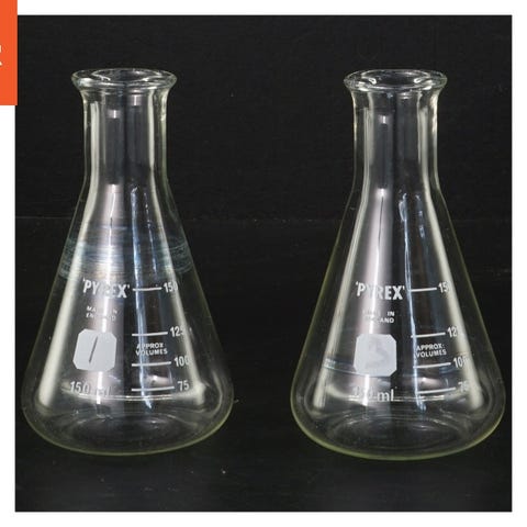 Disse erlenmeyer kolber er lavet af Pyrex glas og har en kapacitet på 500 ml. De er perfekte til laboratoriebrug eller som dekorative stykker i hjemmet. Kolberne er fremstillet i England og har volumenmarkeringer for 200 ml, 300 ml, og 400 ml. Højden er cirka 17,5 cm.