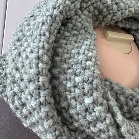 Strikket rør-tørklæde i håndfarvet uld med gråt farveforløb. Strikket i perlestrik. Lækker, lun og blød kvalitet.