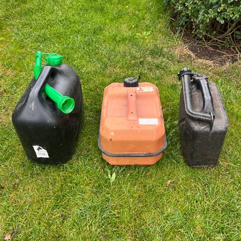 En grøn reservedunk med en kapacitet på 5 liter. Den har en fastmonteret sort tud til at lette hældning, og er mærket med advarsler og instruktioner for sikker opbevaring af petroleumsprodukter.
