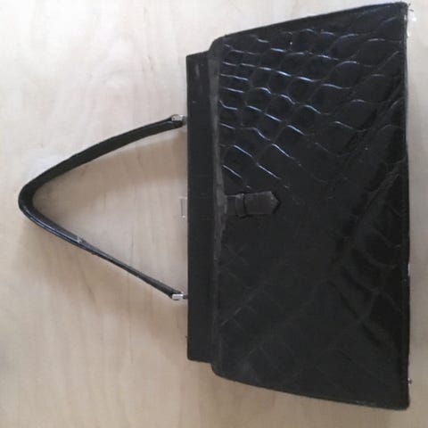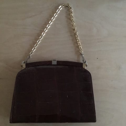 Denne vintage håndtaske har et krokodillemønster i en brunlig farvetone. Tasken har en enkel rem til at bære den i hånden, og guldtonede metalbeslag der fremhæver dens design. Den kommer med en matchende pung. Tasken måler 25,5x8 cm.