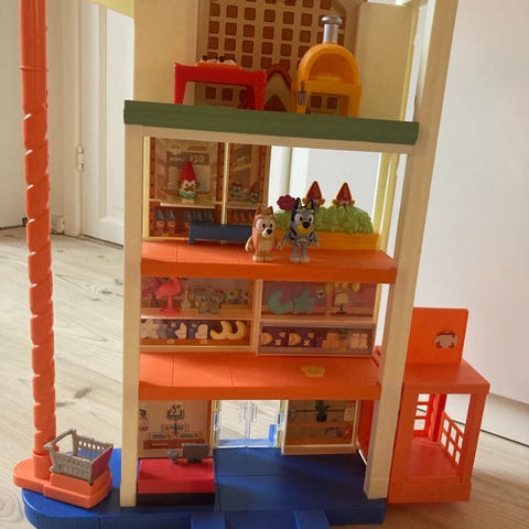 Bluey legetøjssæt med campingvogn, bil og figurer. Sættet indeholder en rød bil, en campingvogn der kan åbnes med indrettet køkken, spiseplads og køjesenge, samt flere Bluey-figurer. Der medfølger blandt andet to små figurer på løbehjul med hjelme samt tre stående figurer fra Bluey-universet. Sættet er egnet som rolleleg med tema fra Bluey-serien og kan kombineres med andet Bluey-legetøj i samme størrelse.