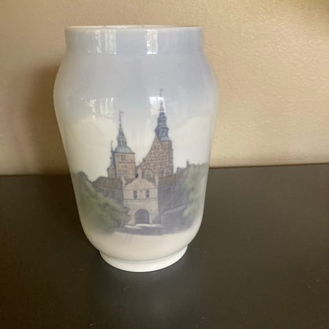 Dette er et sæt af to porcelænsvaser fra Bing & Grøndahl. Den ene vase har en højde på 11 cm og en diameter på 6 cm, mens den anden vase er 10,5 cm høj med en diameter på 7 cm. Begge vaser har et blåt og hvidt farveskema med naturskønne motiver, der inkluderer en strand og kaktus. Bunden af vaserne viser Bing & Grøndahls logo samt nummerering.