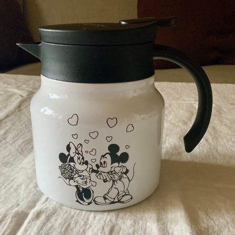 Dette er en termokande med en kapacitet, sandsynligt, mellem 1 til 1,5 liter, lavet af metal med en skinnende kromfinish. Den har en sort plastiklåg og håndtag, der giver et godt greb. Kanden er pakket i en sort og beige papæske, der viser mærket Aladdin.
