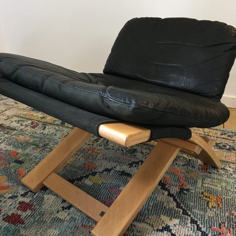 Lidt slid på armlæn og skammel men ellers rigtig pæn i læderet. Har en lille limning i finer på et af benene men ses ikke (se billede)