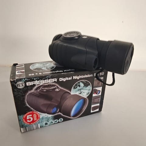 Sytong HT-66 natkikkert i digital udgave. Enheden er i sort plast/metal og leveres i original æske med formstøbt indsats. På billederne ses selve natkikkerten med gummi-øjestykke, betjeningsknapper, USB-port, batteri samt dæksel og medfølgende dokumentation. Egnet til observation i mørke omgivelser, f.eks. udendørs brug og overvågning, hvor der er behov for digital natoptik.