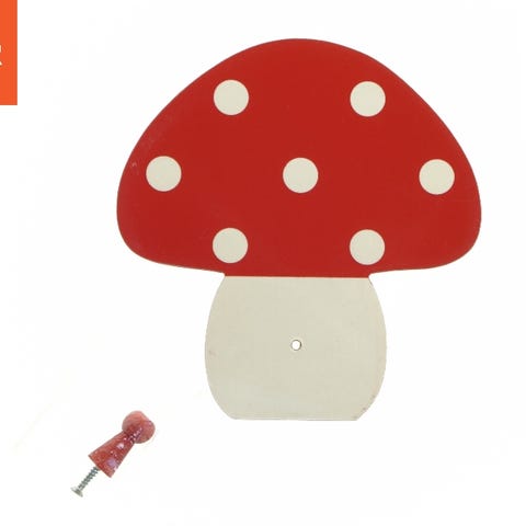 Svampeknagen har en flot rød top med hvide prikker og leveres med en skrue for nem montering af knop/knage. Den er designet til at blive hængt op på væggen og er ideel til at hænge tøj eller tasker. Bagsiden afslører de to monteringspunkter og har en webadresse påtrykt, hvilket antyder producentens eller designerens webside.