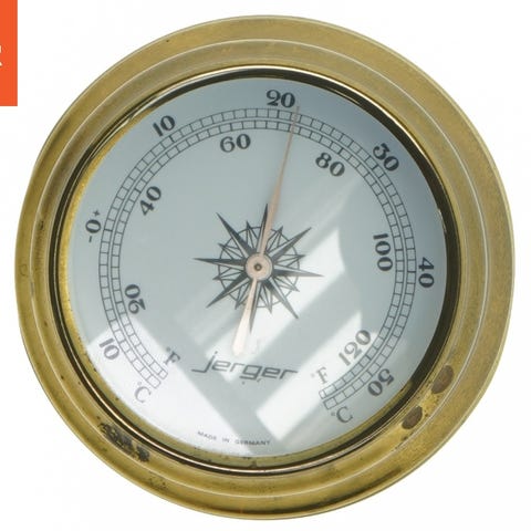 Dette er et klassisk messingbarometer designet med en hvid skive, der viser atmosfærisk tryk, med indikationer som 'RAIN', 'CHANGE', 'FAIR' på engelsk og 'VERÄNDERLICH', 'SCHÖN', 'REGEN' på tysk. Barometeret er i en rund form med dimensionerne Ø 15x8 cm. Det har en glasoverflade og kan monteres på væggen. Bagsiden viser lidt slid, men holdbarheden af messingkonstruktionen er stadig god og klar til brug. Tags: barometer, messing, vægmontering.