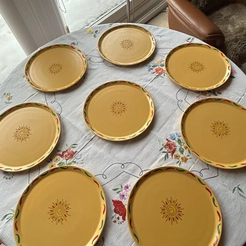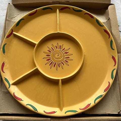 4 stk Tex Mex - sælges samlet. Sagaform serveringsfad med flere rum i gul farve. Rundt fad opdelt i sektioner med midterdel, egnet til servering af snacks, tapas eller tilbehør. Dekoreret med farvede motiver på bunden af rummene. Kan også bruges som spisetallerken med de opdelte rum.