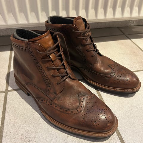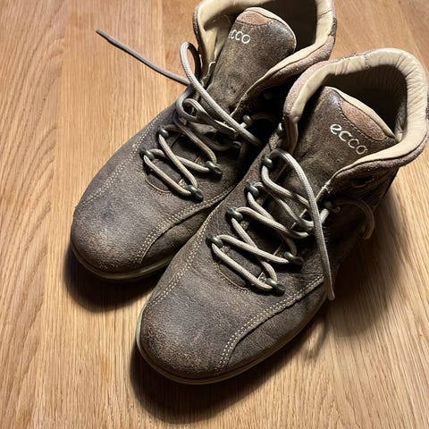 Ecco støvler i sort læder i størrelse 46. Modellen er en ankelhøj snørestøvle med kraftig, mønstret gummisål og hælstrop bagtil. Overdelen er glat læder med polstret skaft for øget komfort omkring anklen. Støvlerne egner sig til hverdagsbrug og udendørsaktiviteter, hvor der er behov for god støtte og solid sål.