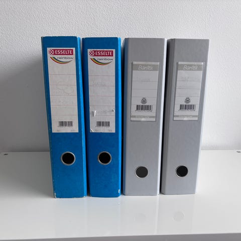 Ringbind/mapper Esselte og Bantex. Især i farverne: sort/antracit og hvid, men også få rød og en lyseblå og en enkelt orange. Sælges p. gra. flytning. 27 stk