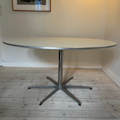 Fritz Hansen Arne Jacobsen rundt bord med hvid bordplade og stel i metal. Bordet har en central søjle med seks ben i stål, som giver god stabilitet og benplads. Velegnet som spisebord eller mødebord. Designet er enkelt og funktionelt med klassisk Arne Jacobsen-udtryk. På billederne ses mindre brugsspor på kanten af bordpladen. Mærkat fra Fritz Hansen er monteret på undersiden af bordpladen.