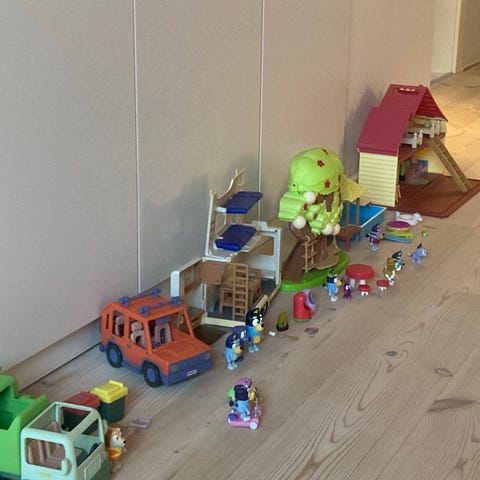 Bluey legesæt med figurer og køretøjer. Sættet omfatter flere Bluey-figurer samt forskellige legescenarier, herunder hus, træ med legeplads, poolområde og køretøjer som bil og campingvogn. De små figurer er i plast og passer til de medfølgende legemiljøer og køretøjer. Velegnet til rolleleg for børn, der kender universet fra Bluey-tegneserien.