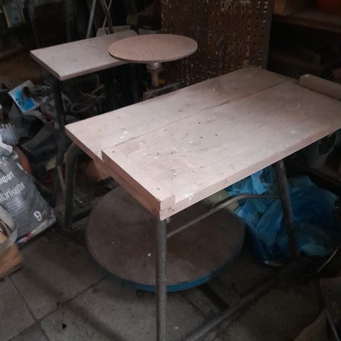 Drejeskive til keramik med tilhørende arbejdsbord. Konstruktionen består af en rund drejeskive monteret på metalstativ med fodplade samt et rektangulært bord med lys bordplade. Egnet til arbejde med ler og keramik i værksted eller hobbyrum, hvor der er behov for stabil arbejdsflade og roterende plade til formgivning.
