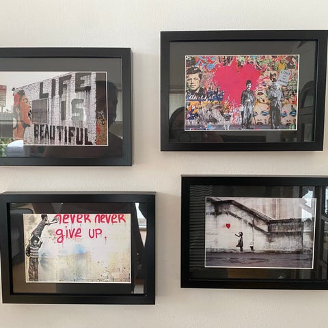 Vægbilleder med abstrakt motiv i dæmpede beige og brune nuancer. Billederne er indrammet i enkle, sorte rammer. Motivet består af organiske, bølgede former i lyse og mørke toner. Egnet til ophæng i stue, kontor eller andre opholdsrum. Sælges som sæt, som vist på billederne. Afhentes i Gødvad, Silkeborg. Sælges helst samlet.